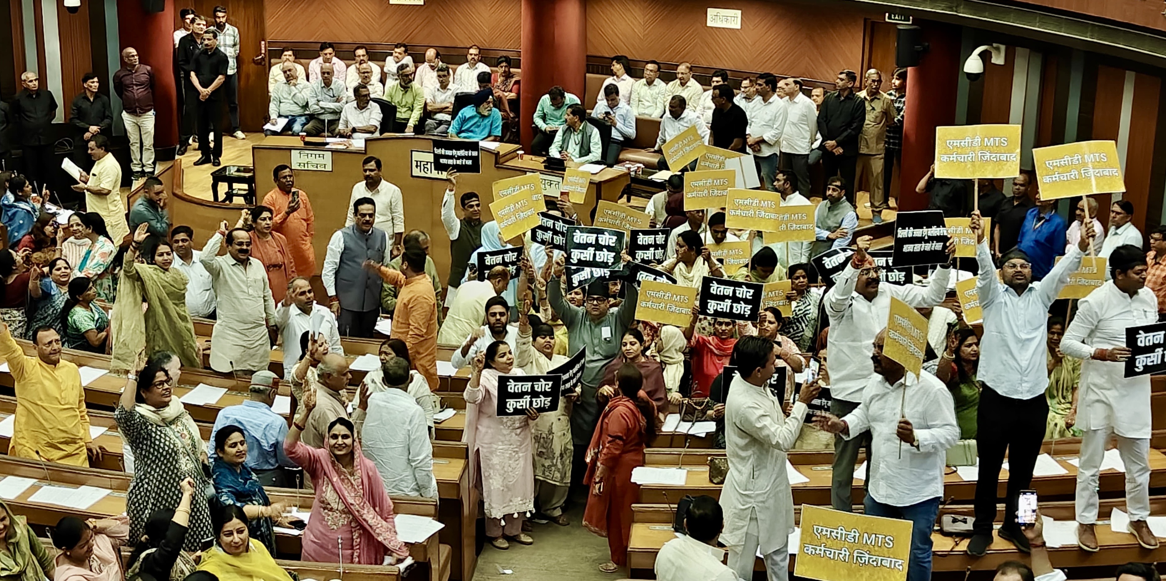 दिल्ली: पिछले 16 दिनों से समान वेतन समेत अन्य मांगों को लेकर भूख हड़ताल पर बैठे MTS-CFW कर्मचारियों के समर्थन में आम आदमी पार्टी के पार्षदों ने एमसीडी के सदन में काली पट्टी बांधकर प्रदर्शन किया। नेता प्रतिपक्ष अनुश नारंग के नेतृत्व में "आप" पार्षदों ने कर्मचारियों की हड़ताल के चलते दिल्ली में लगातार बढ़ रहे डेंगू, मलेरिया और चिकनगुनिया के केस को लेकर भाजपा सरकार से जवाब मांगा। इस दौरान अंकुश नारंग ने कहा कि दिल्ली में डेंगू-मलेरिया के केस ने सारे रिकॉर्ड तोड़ दिए हैं, फिर भी भाजपा को दिल्लीवालों की चिंता नहीं है। चार इंजन की भाजपा सरकार दिल्ली को लूटने और मेहनतकश कर्मचारियों के हक़ का वेतन चुराने का काम कर रही है। भाजपा सरकार और महापौर ने निगम को अपनी लूट का अड्डा बना दिया है, कर्मचारी सड़क पर हैं और सफाई ठप है। मैने कर्मचारियों की मांगे तत्काल पूरी करने को लेकर निजी बिल पेश किया, लेकिन भाजपा ने स्वीकार नहीं किया।