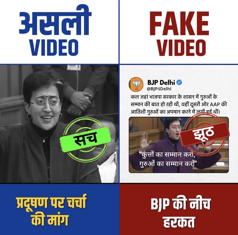 दिल्ली: गुरु महाराज की अवमानना के मामले में ट्विटर के माध्यम से प्रतिक्रिया व्यक्त करते हुए विधानसभा की नेता प्रतिपक्ष सुश्री आतिशी ने दो वीडियो का हवाला देते हुए सत्ता पक्ष पर साधा निशाना कहा कि बीजेपी ने गुरु तेग़ बहादुर जी के नाम को ग़लत तरीक़े से इस्तेमाल किया और गुरु साहब का अपमान किया। उन्होंने एक वीडियो ट्वीट किया जिसमे गुरु साहब के बारे में दो झूठ कहे हैयह वीडियो गुरु तेग़ बहादुर जी की शहीदी के 350 साल की चर्चा समाप्त होने के बाद का है, जब एलजी के अभिभाषण पर चर्चा शुरू थी। वीडियो में मैंने बीजेपी के प्रदूषण की चर्चा से बचने और उनके विधान सभा में आवारा कुत्तों के मुद्दे पर हुए प्रोटेस्ट के बारे में कहा है “तो आप कराइये ना चर्चा, क्यों सुबह से भाग रहें हैं? कह रहें हैं, कुत्तों का सम्मान करो! कुत्तों का सम्मान करो! अध्यक्ष महोदय इस पर आप चर्चा कराइए।” लेकिन बीजेपी ने झूठा सब-टाइटल लगा कर गुरु तेग़ बहादुर जी का नाम उसमें डाला।